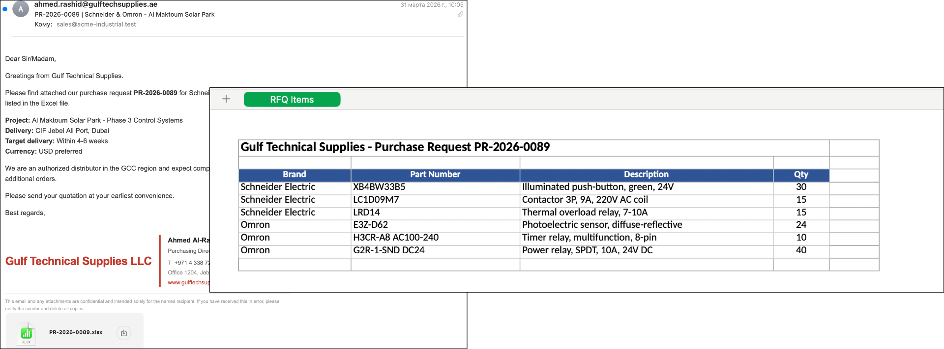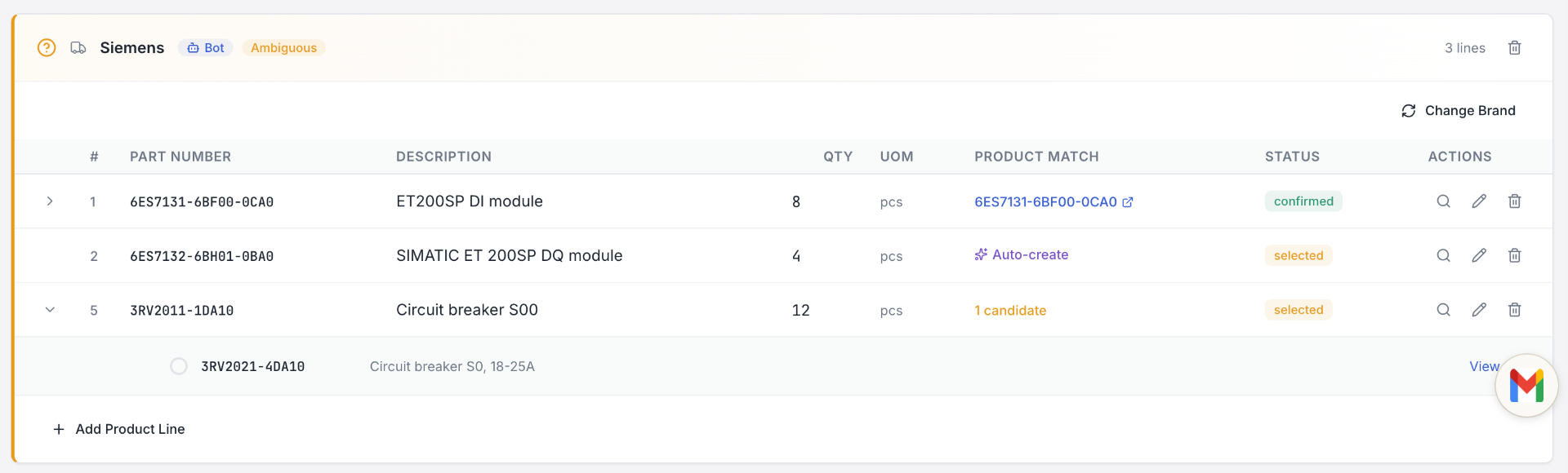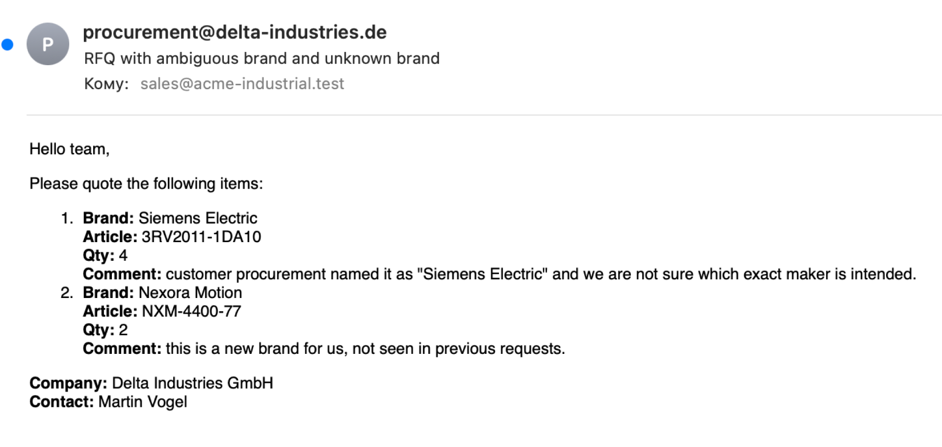 Позиции, бренды и количества извлекаются прямо из текста письма с помощью ИИ-парсинга.