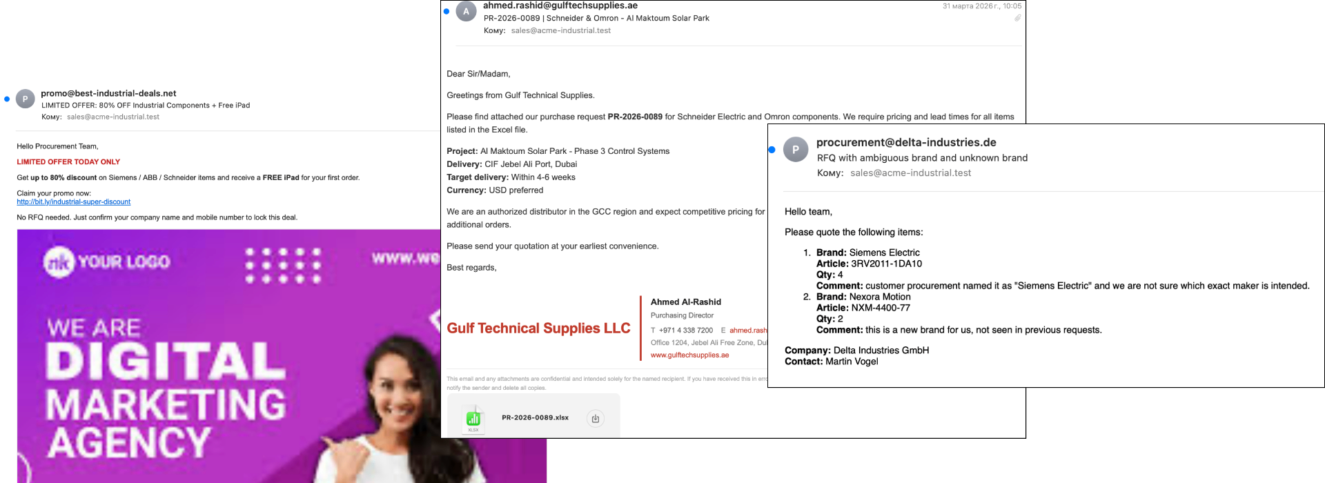 Бот автоматически классифицирует каждое входящее письмо — определяя, является ли оно настоящим RFQ, маркетинговым спамом или сообщением с вредоносным содержимым.