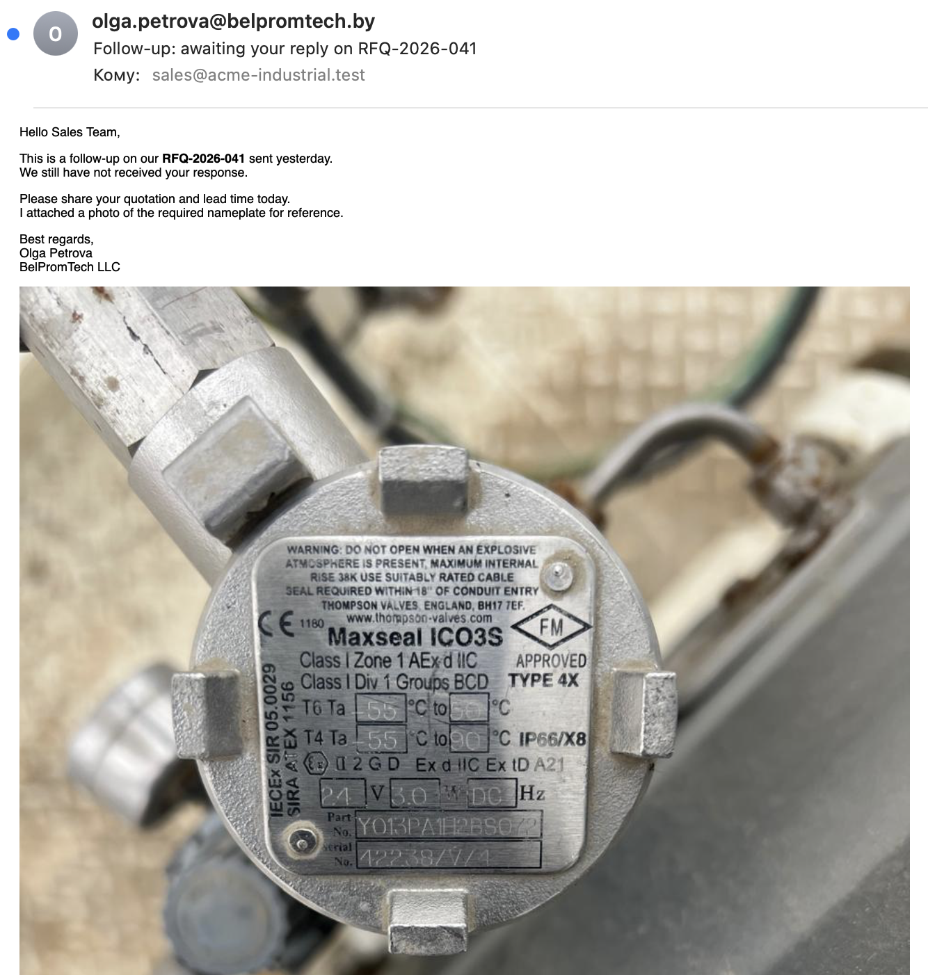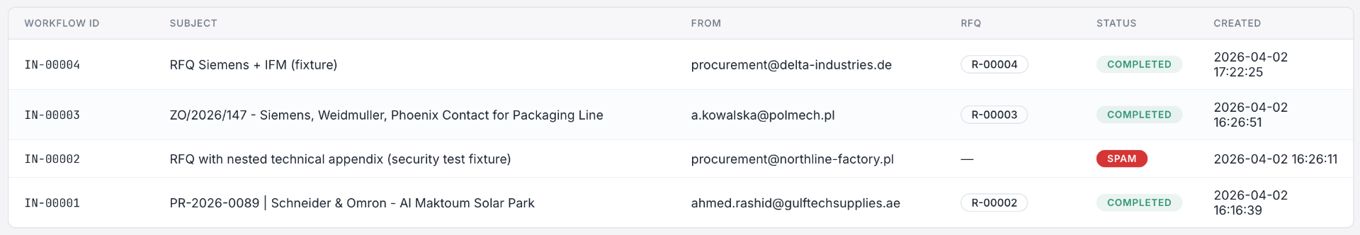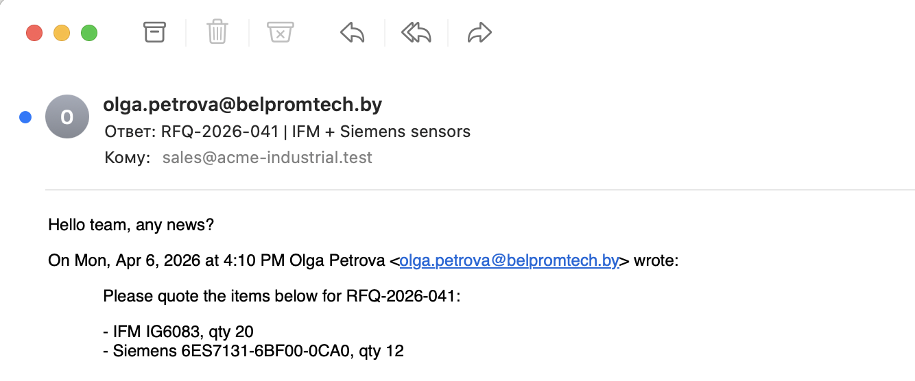 Follow-up письма и дублирующие запросы определяются и связываются с оригинальным RFQ — предотвращая повторную обработку.
